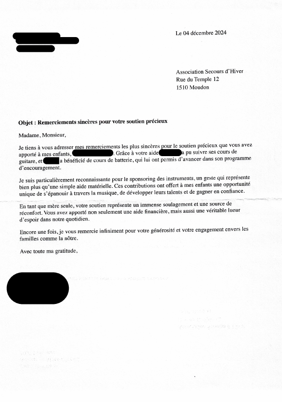 Des remerciements chaleureux au Secours d'hiver Vaud