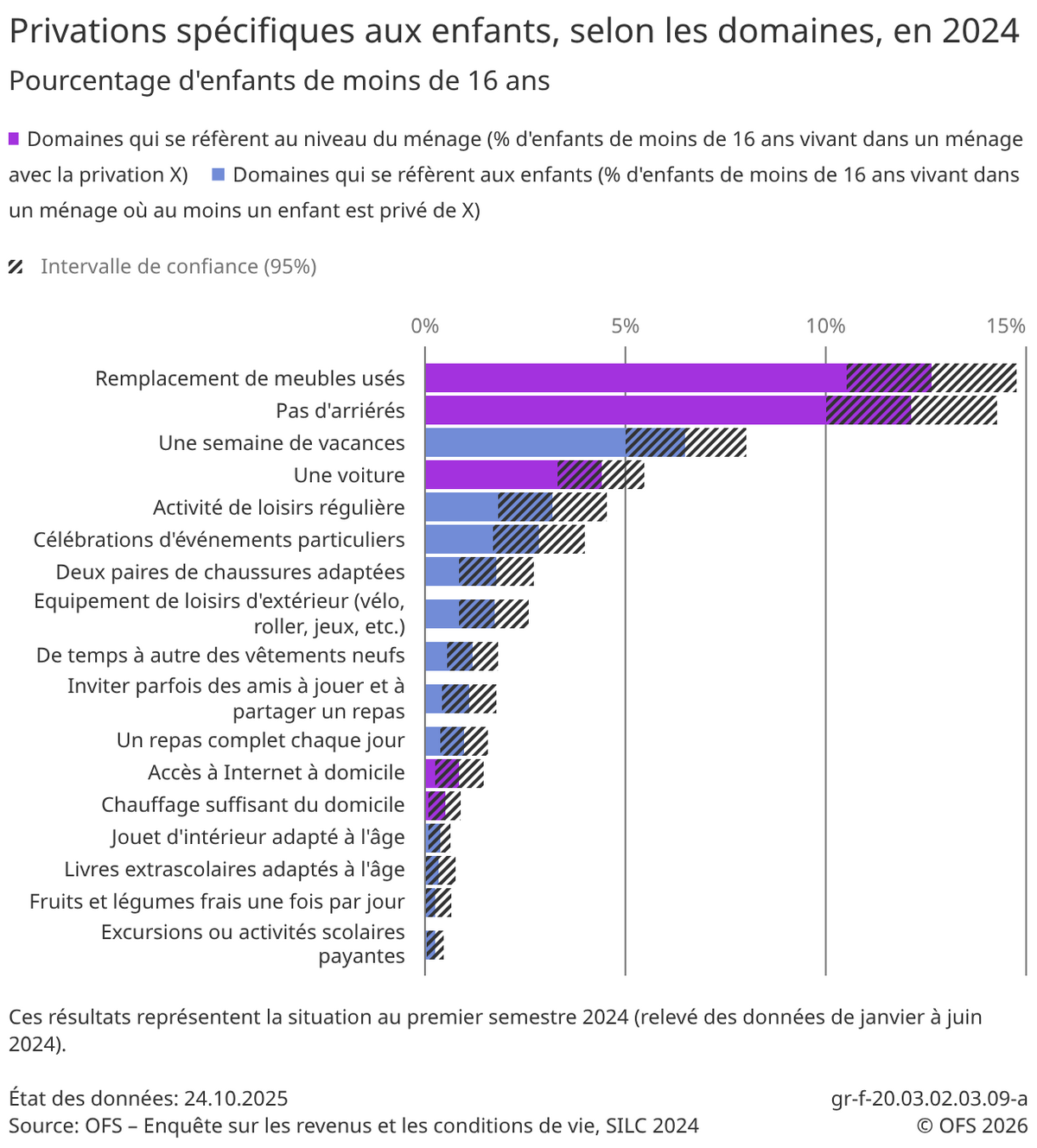 L'Office fédéral de la statistique vient de publier ses enquêtes basées sur les chiffres de 2024. Selon celles-ci, 8,4 % de la population, soit environ 743 000 personnes en Suisse, sont touchées par la pauvreté monétaire. 4,9 % des enfants vivant en Suisse sont touchés par la privation matérielle ou sociale et doivent renoncer à beaucoup de choses qui vont de soi pour leurs camarades. Il s'agit par exemple des vacances, de la participation à des cours de loisirs payants, comme le club de football, ou même simplement de la possibilité de fêter son anniversaire.