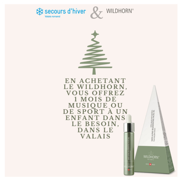 En choisissant Wildhorn, une huile pour la peau 100% naturelle élaborée à partir des régions immaculées du Valais, de Vaud et de Zug, les clients n'adoptent pas seulement une révolution en matière de soins de la peau, mais contribuent également à une cause qui leur tient à cœur. En collaboration avec Secours d’hiver Valais romand, chaque achat de Wildhorn en décembre parraine un mois de sports ou de musique pour un enfant du Valais faisant face à des défis économiques: pour chaque boîte achetée, Wildhorn fera un don de CHF 50 au nom du client au Secours d’hiver Valais romand.